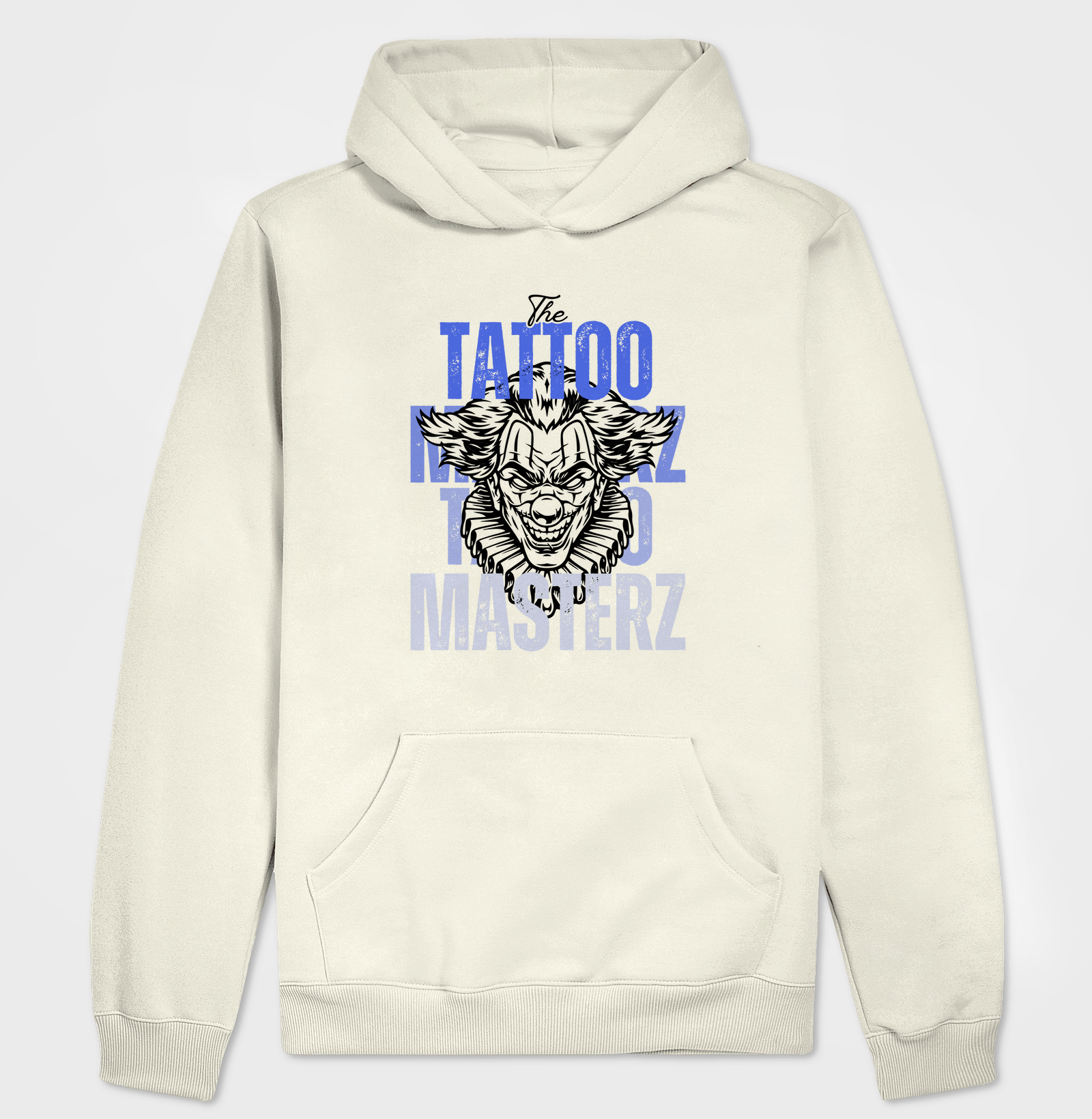Moletom premium com capuz e arte impactante de palhaço feroz com tipografia "The Tattoo MasterZ" em azul vibrante. Design que representa intensidade, ousadia e autenticidade urbana para quem não tem medo de se destacar.
