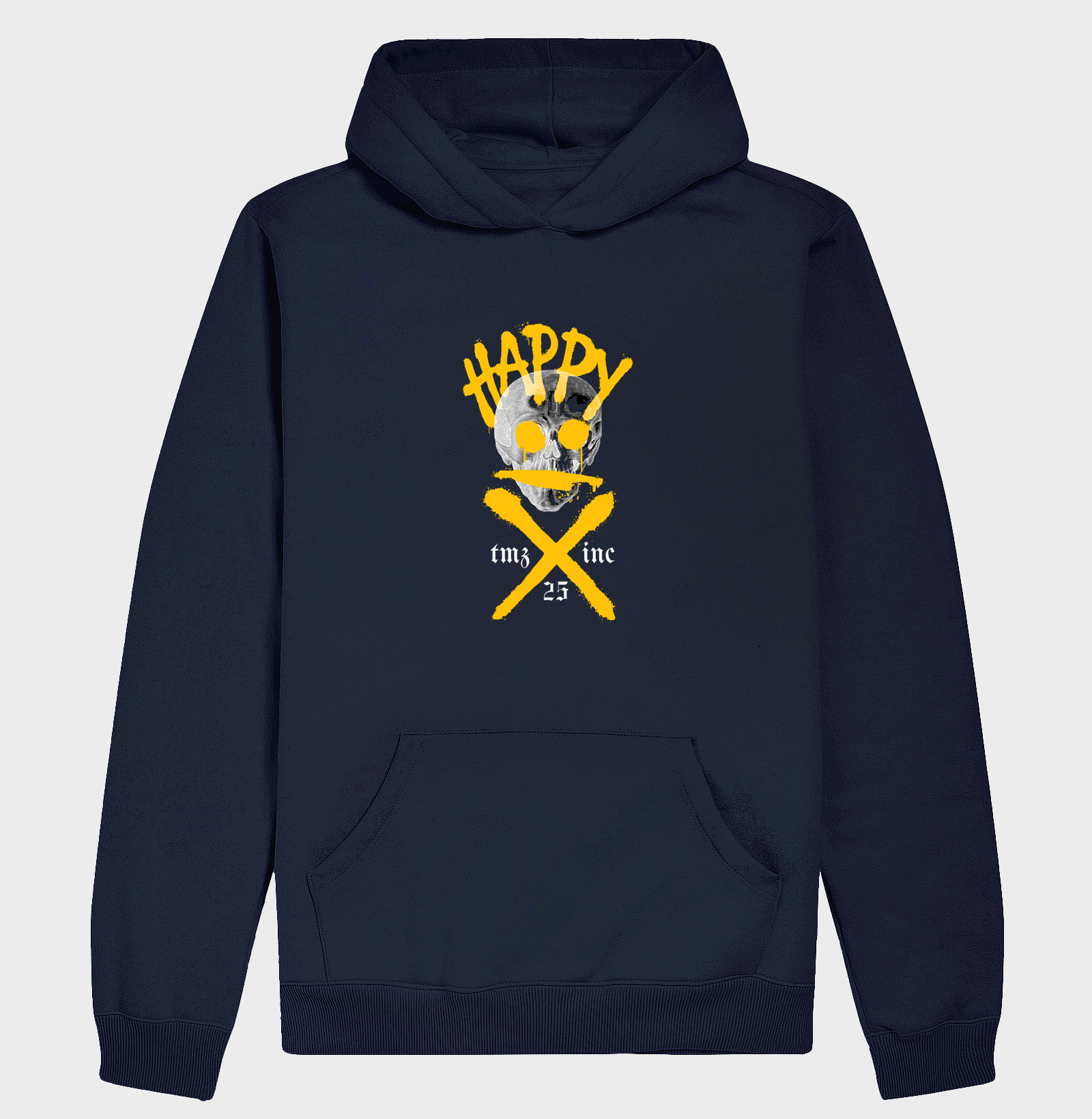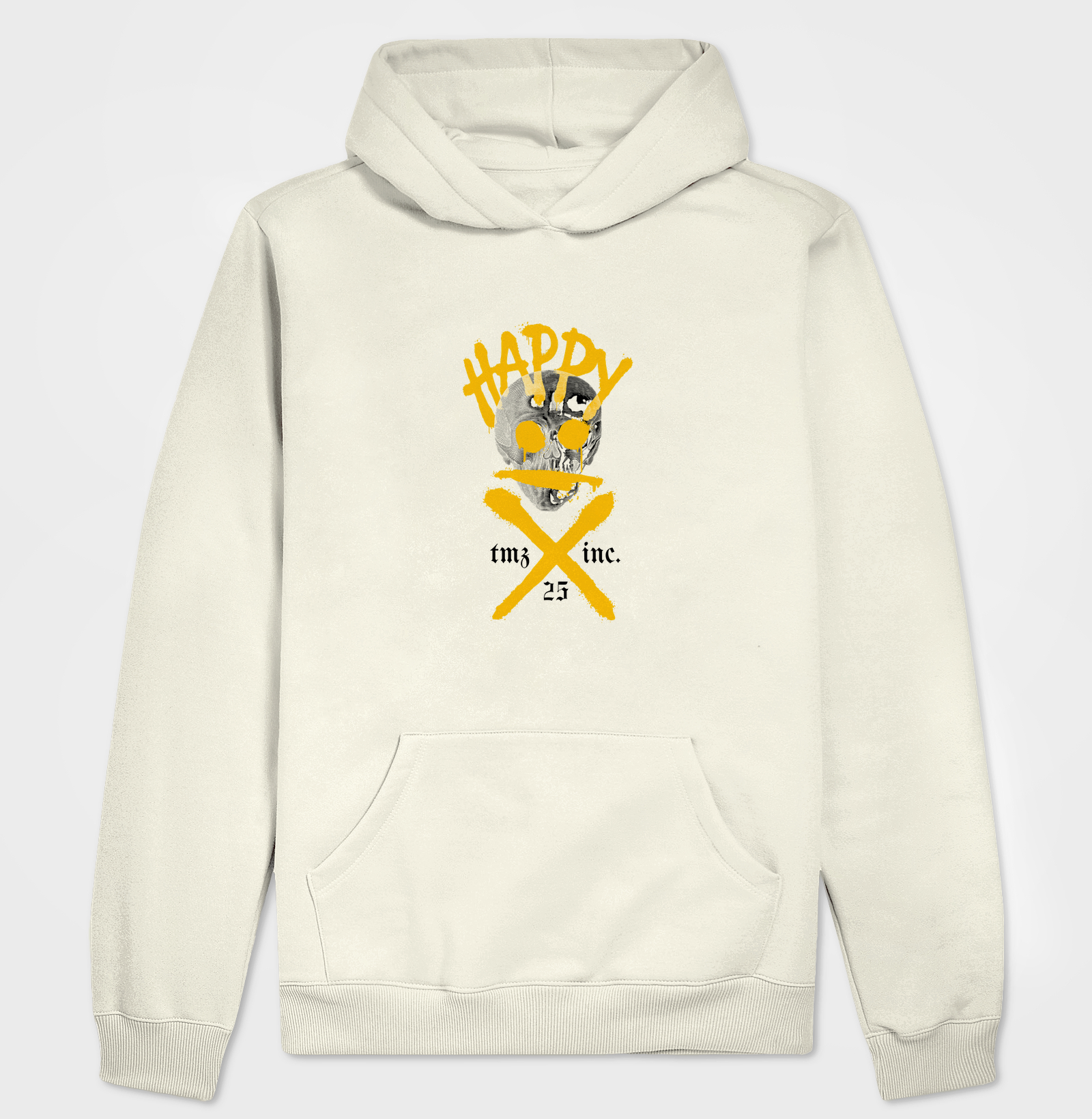 - Arte exclusiva com caveira Happy e pinceladas amarelas